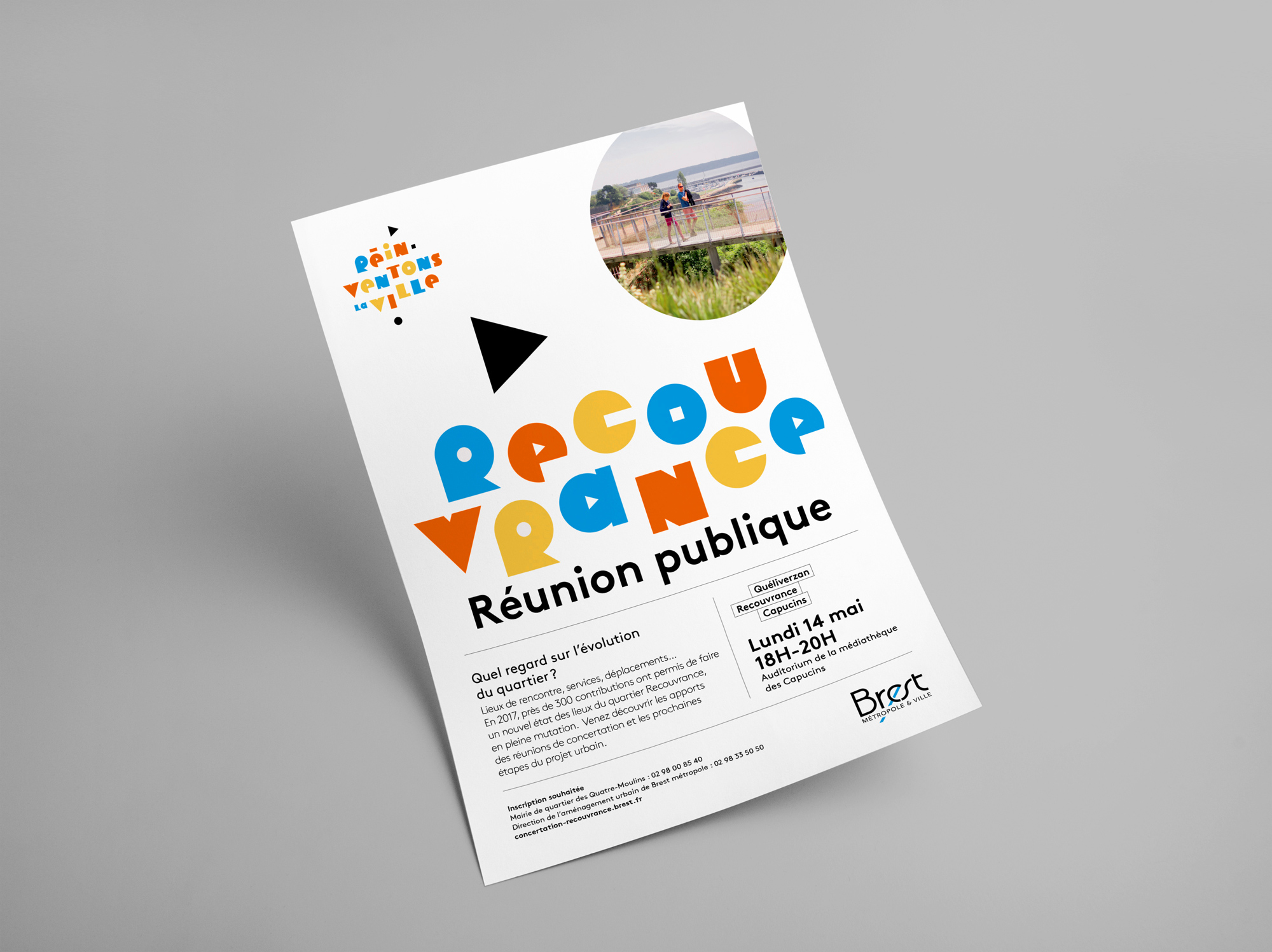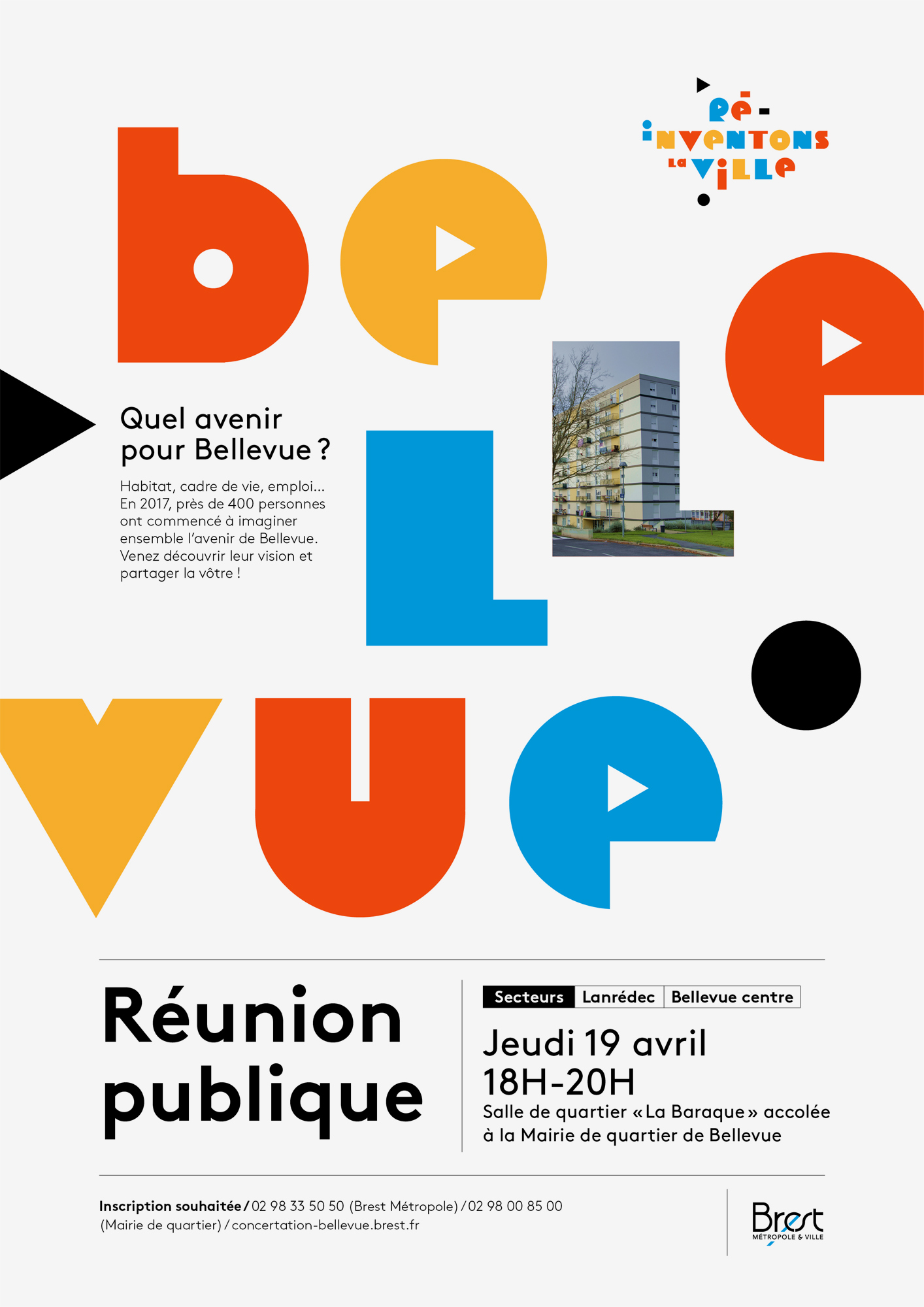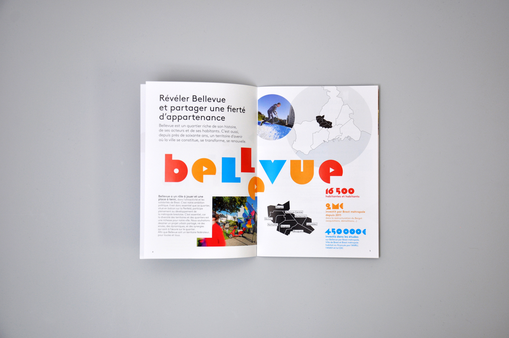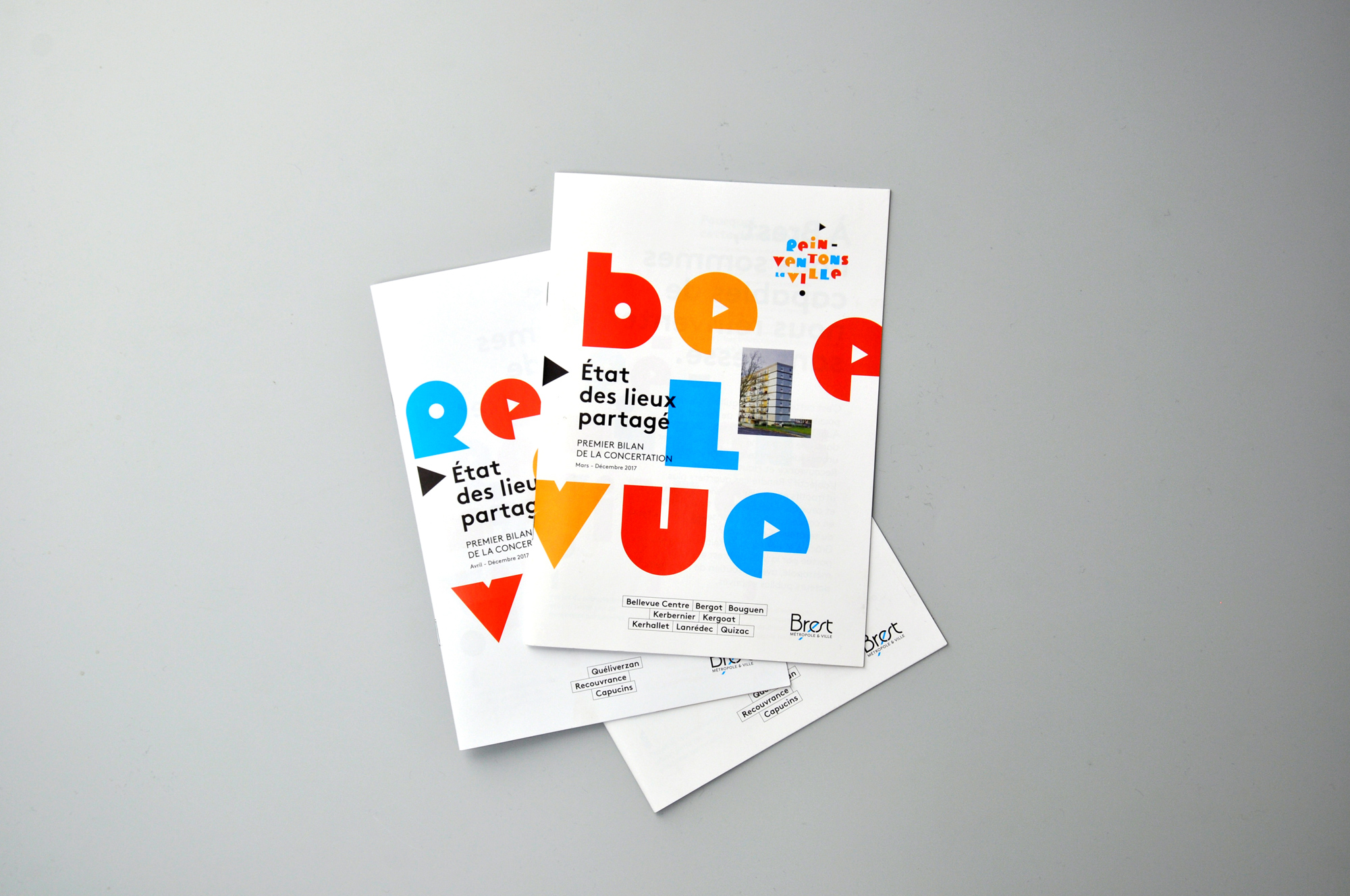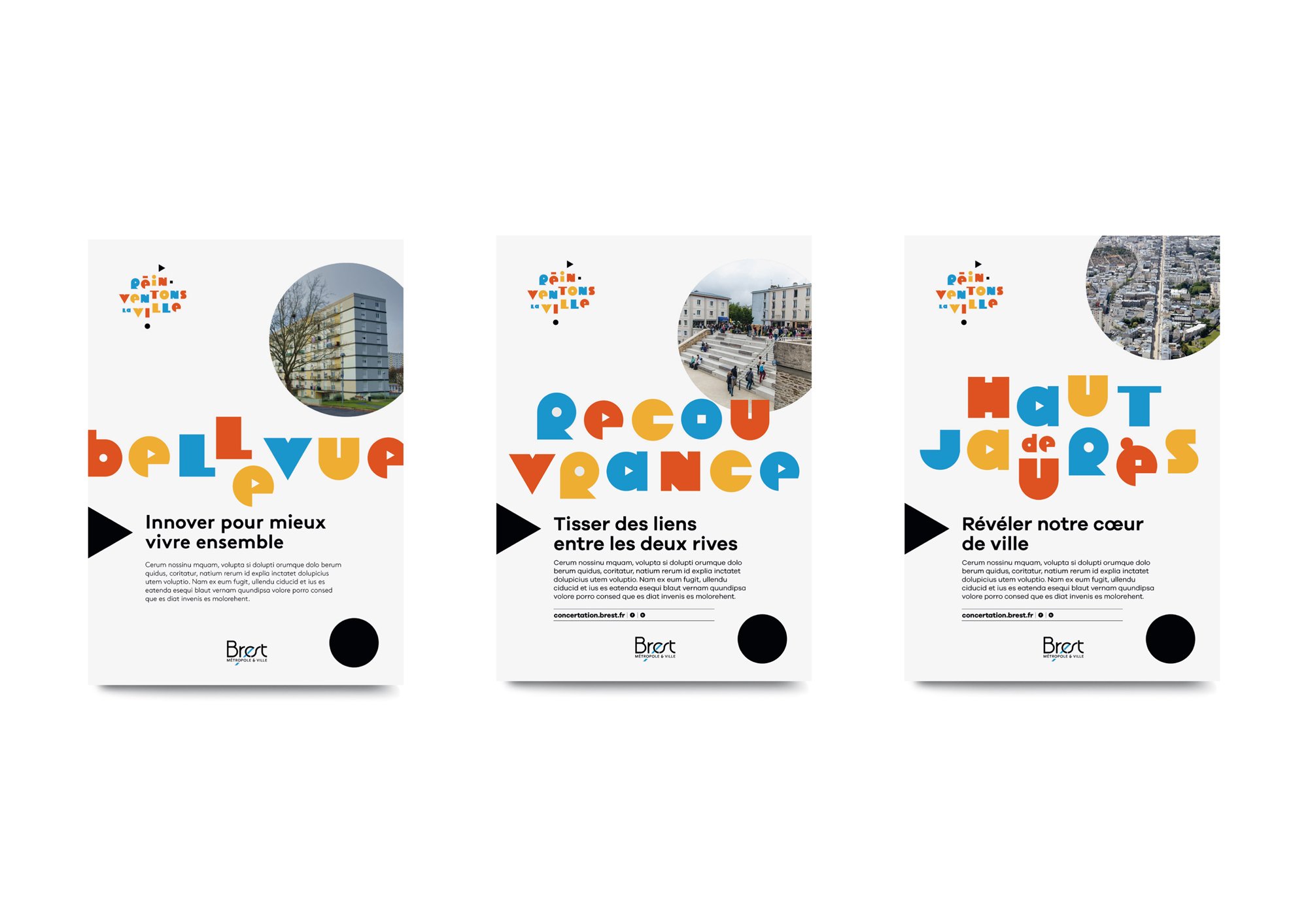 Identité visuelle de ce programme de rénovation urbaine (mis en œuvre par l’Anru), qui concerne trois quartiers de Brest (Bellevue, Recouvrance, Haut de Jaurès) qu’il était nécessaire de distinguer dans la communication. L’identité est déployée sur de nombreux supports : affiches, flyers, brochures, bâches extérieures…