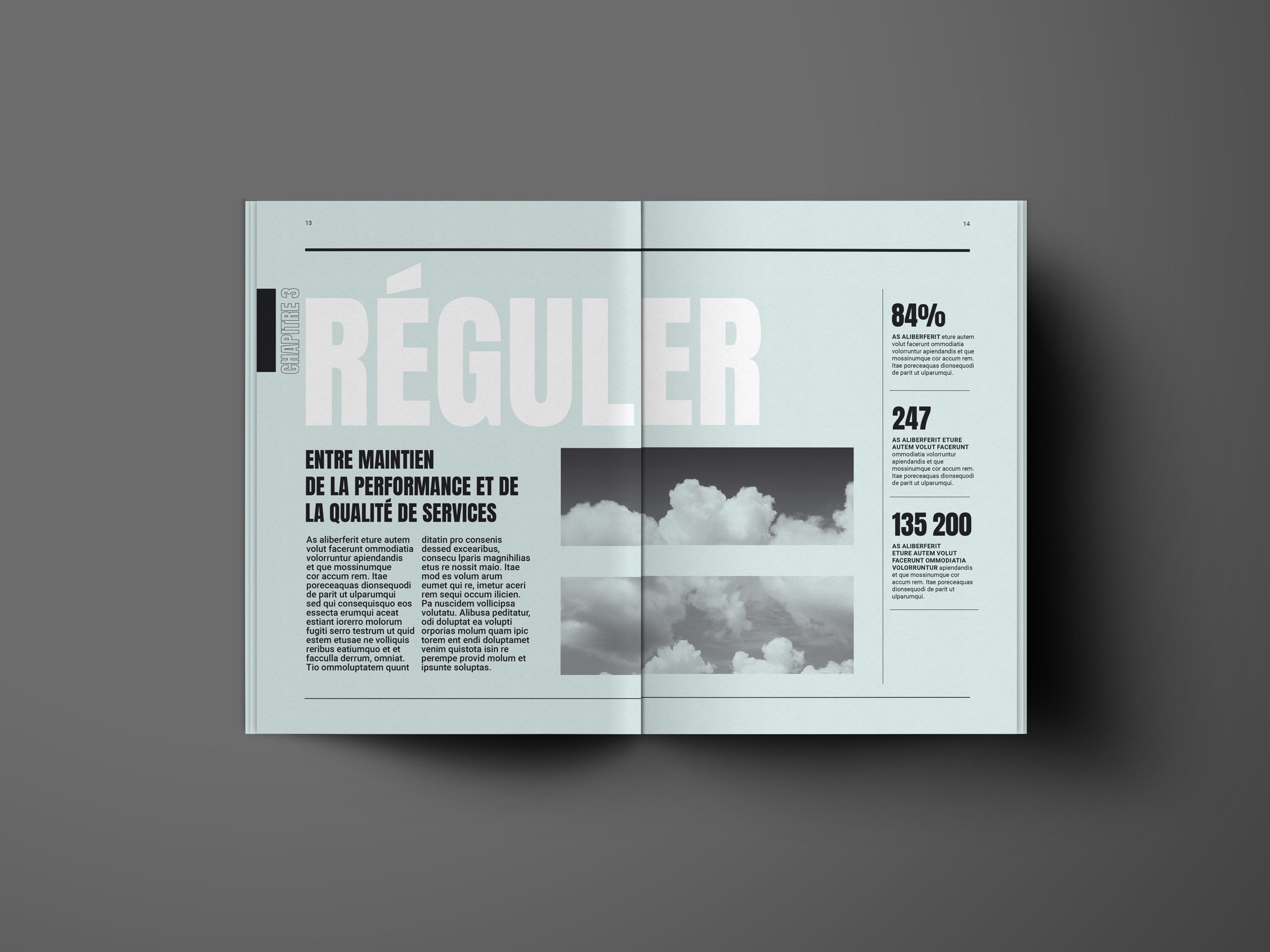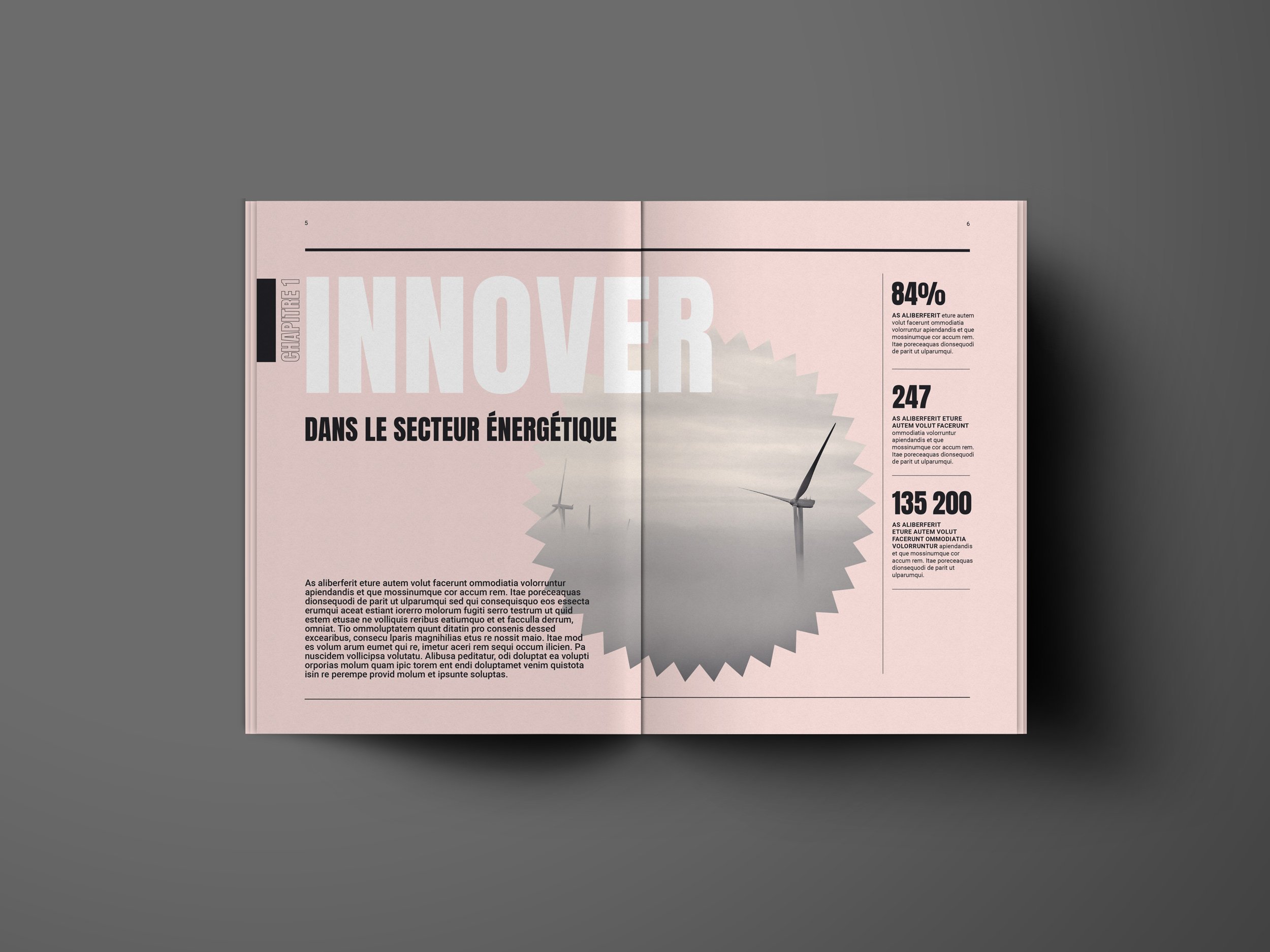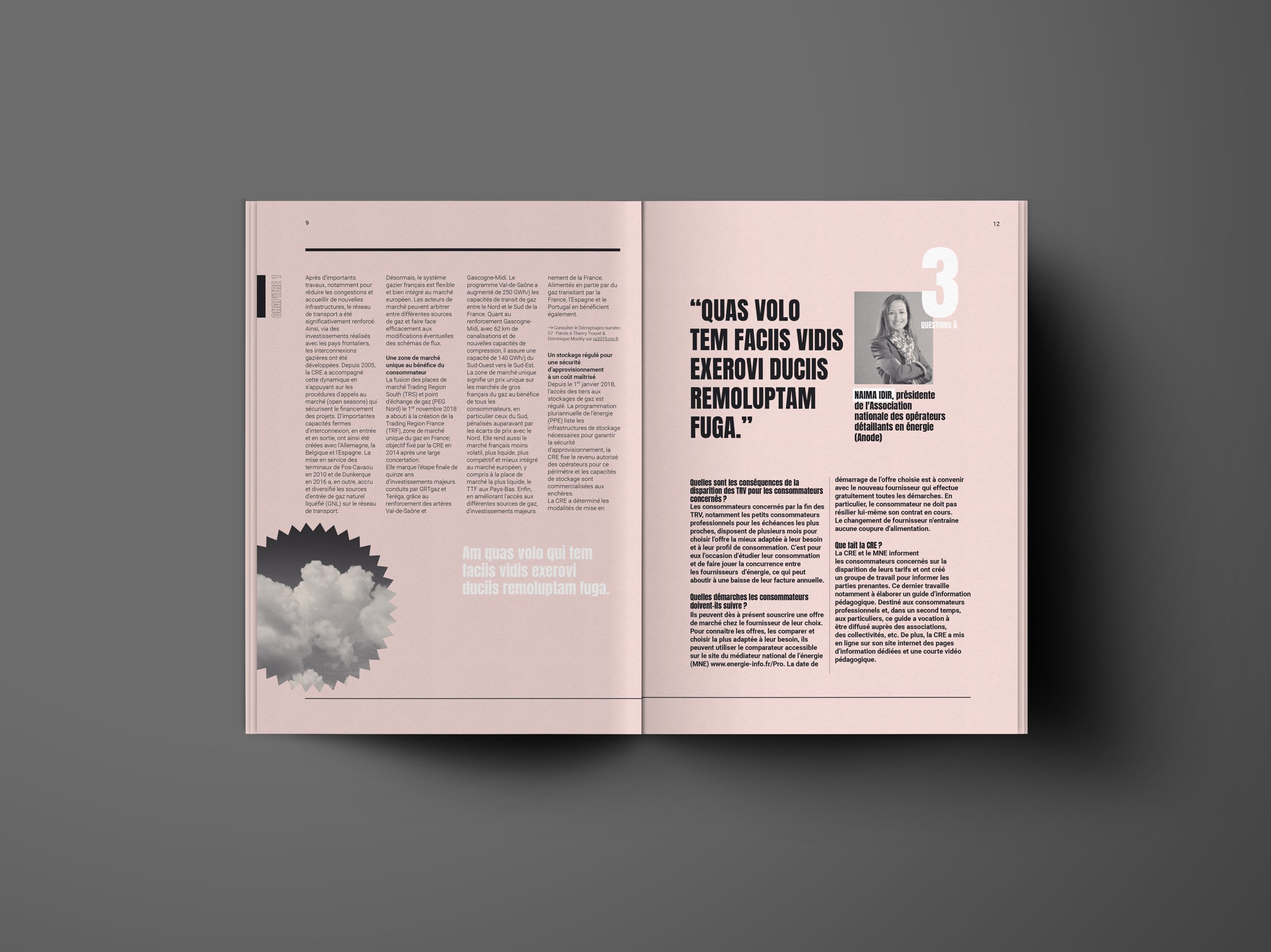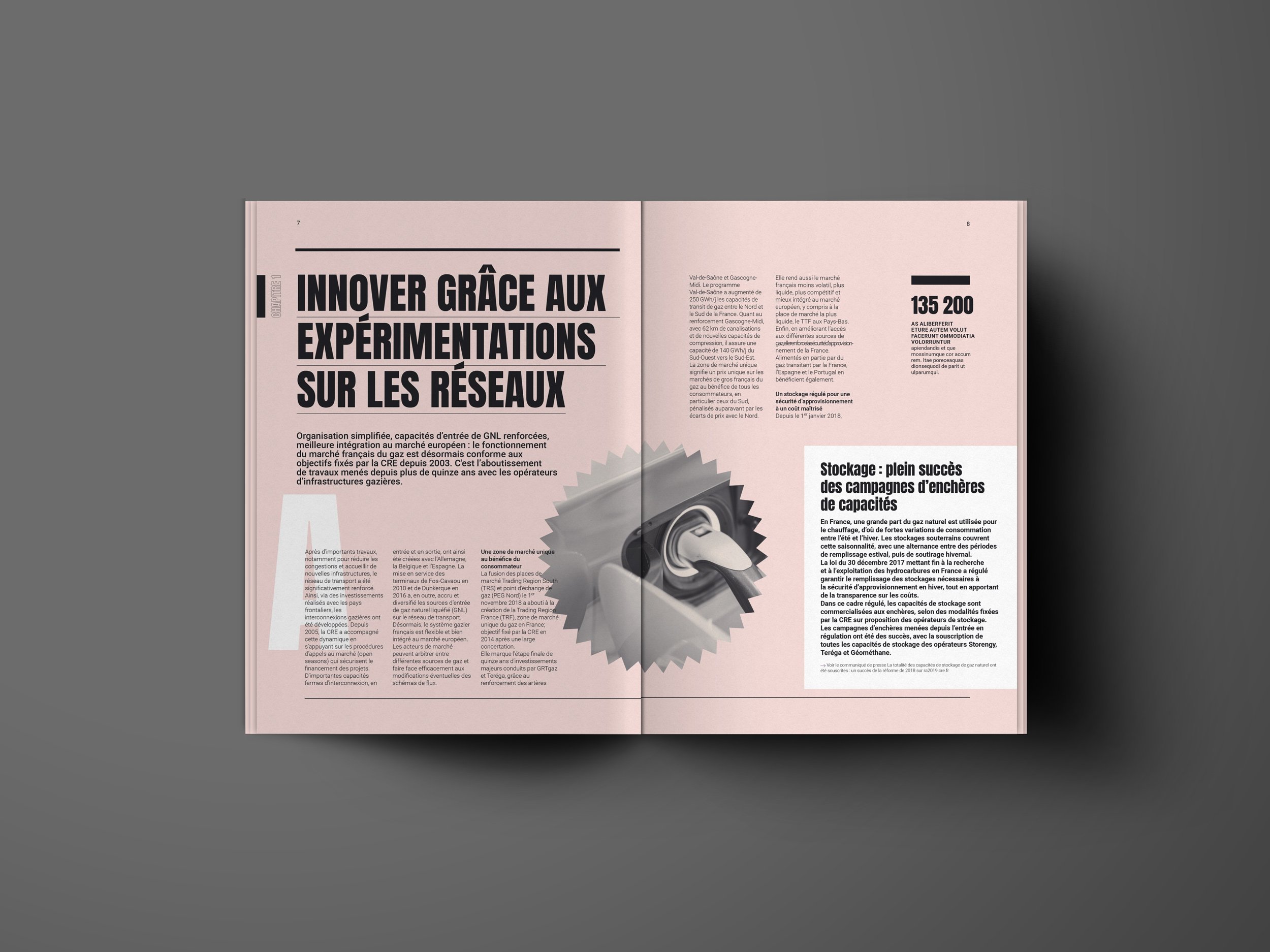 Conception de la maquette du rapport d’activité de la Commission de régulation de l’énergie. Un graphisme minimaliste à la fois fort par ses contrastes et doux par ses couleurs. Une efficacité visuelle en accord avec les actions portées par l’institution, et qui a su séduire malgré une rupture totale avec la charte graphique en place !