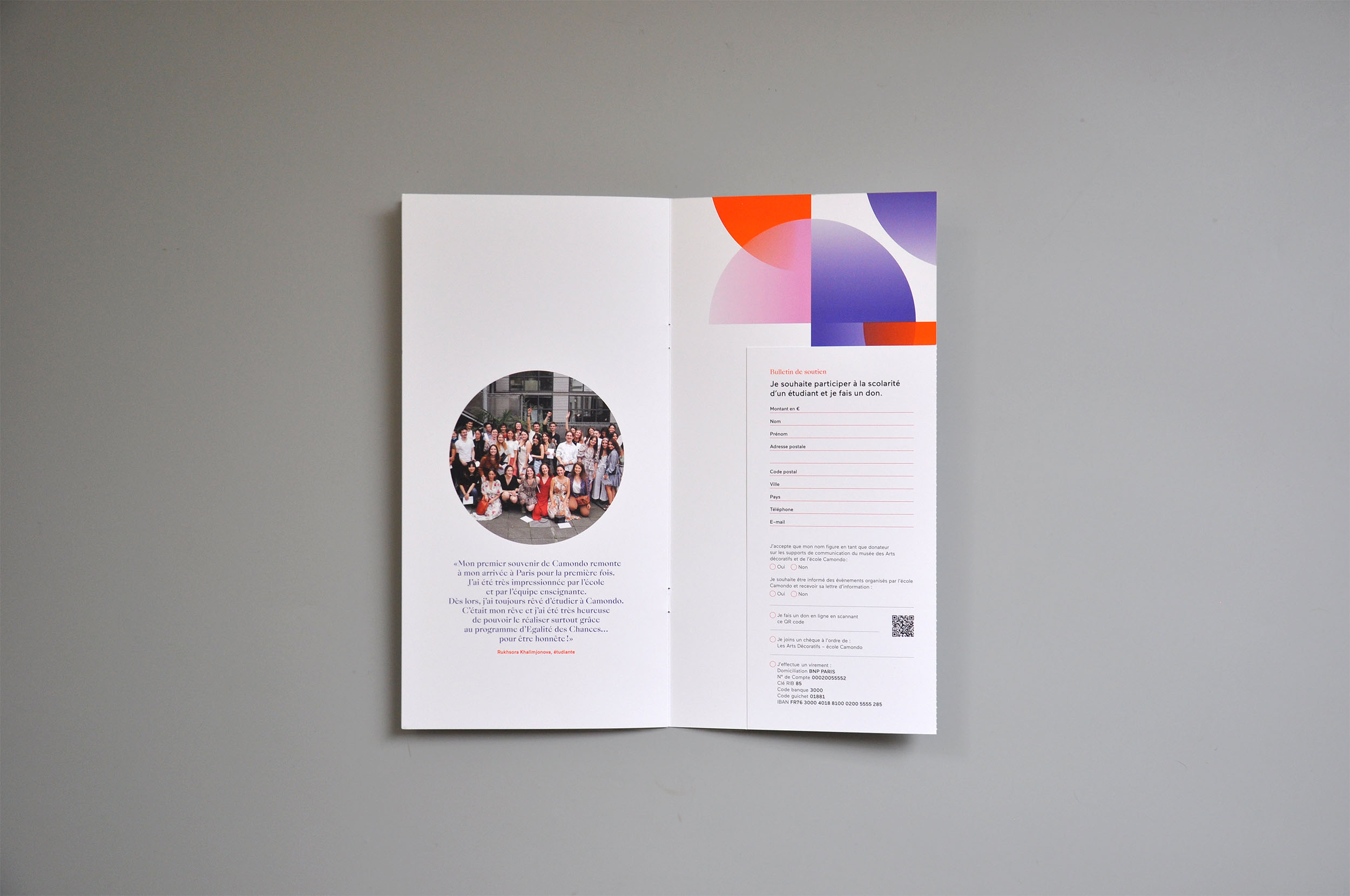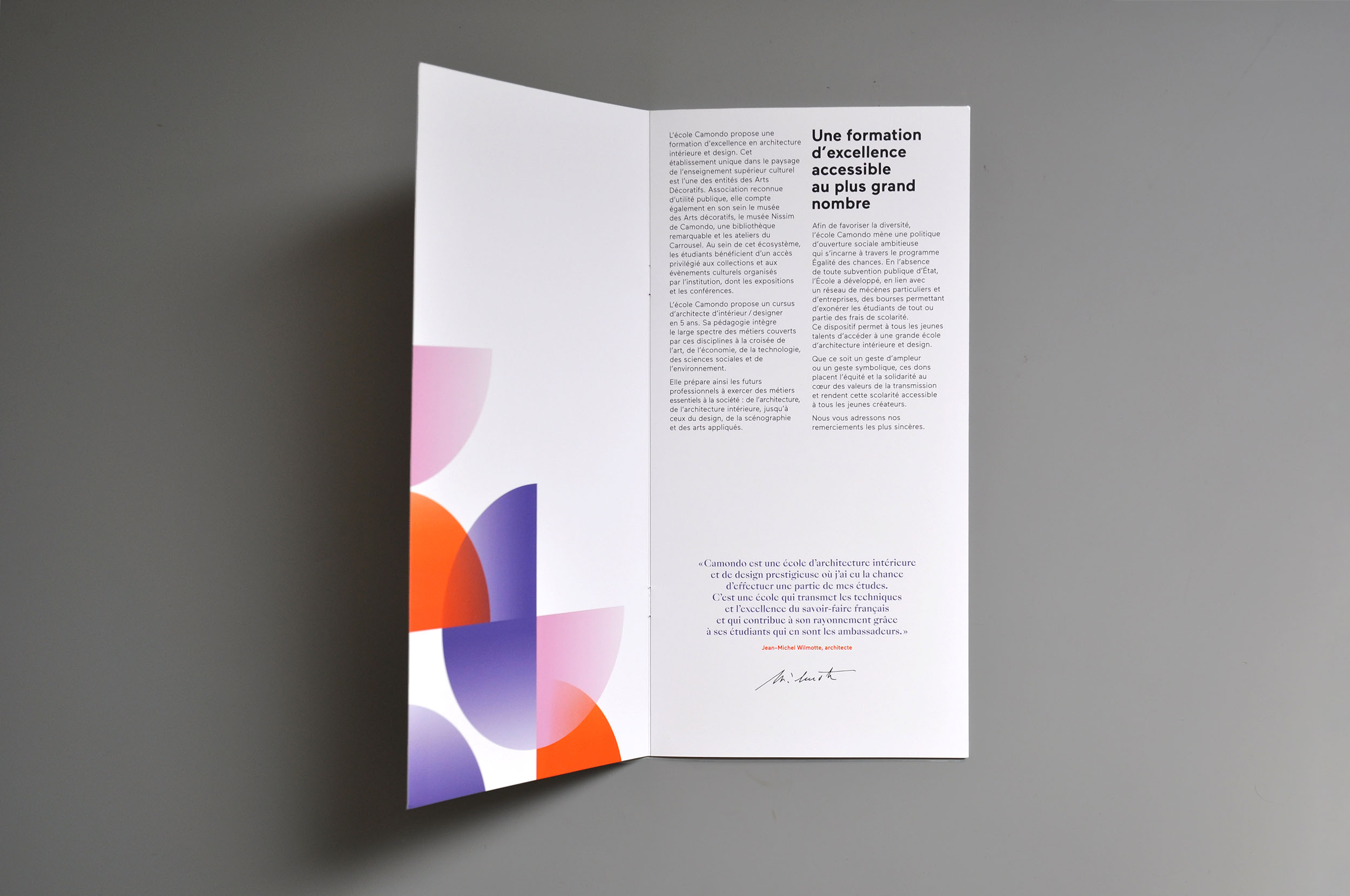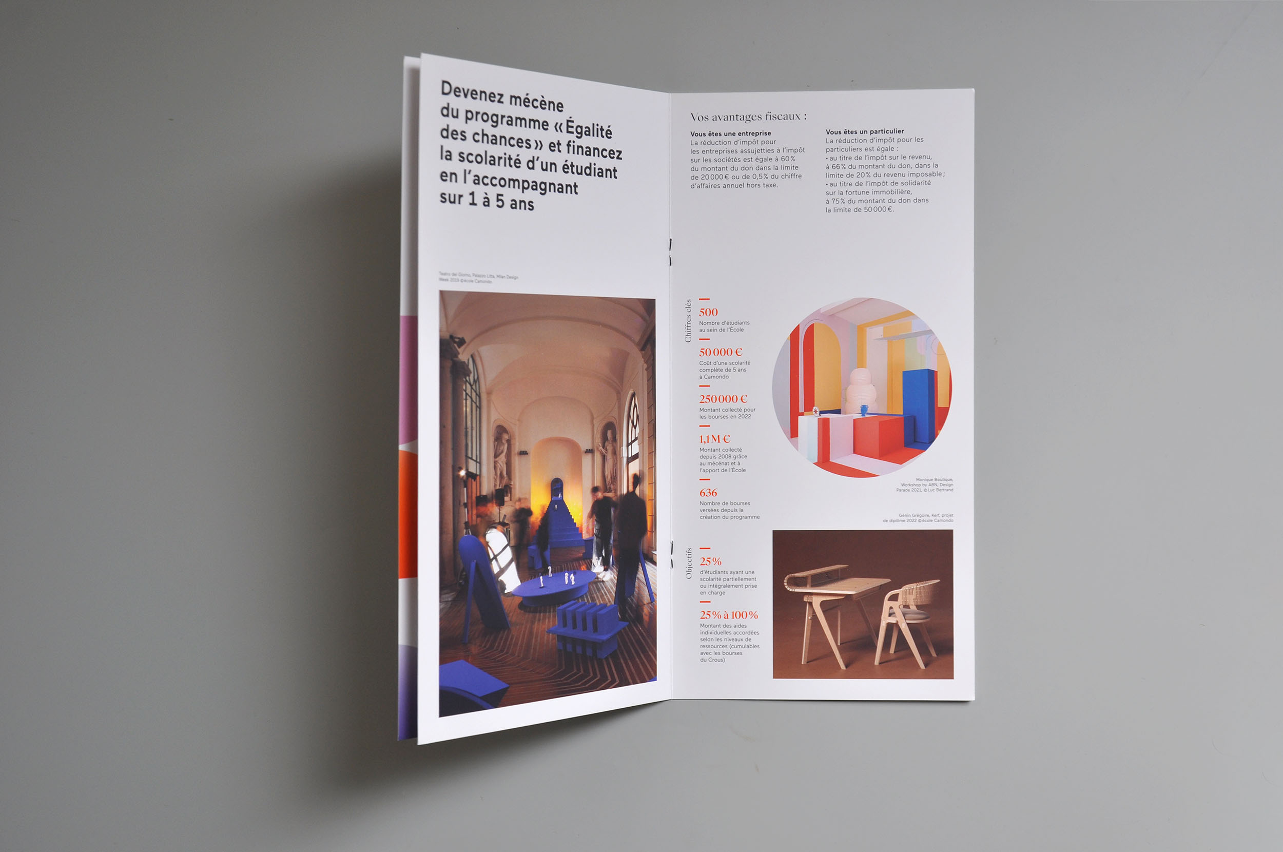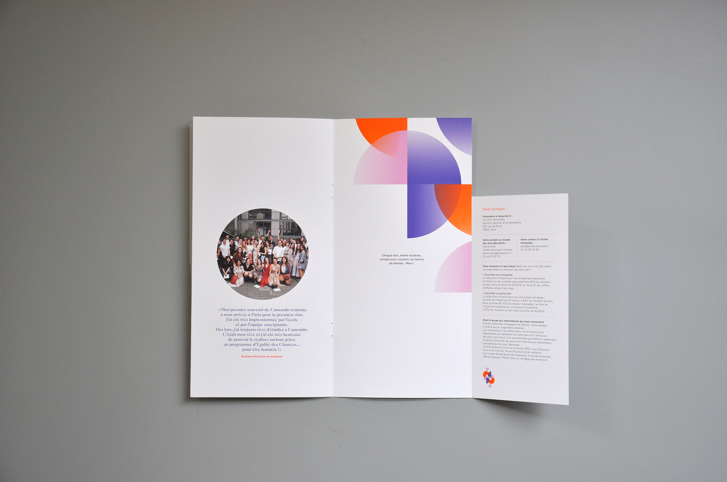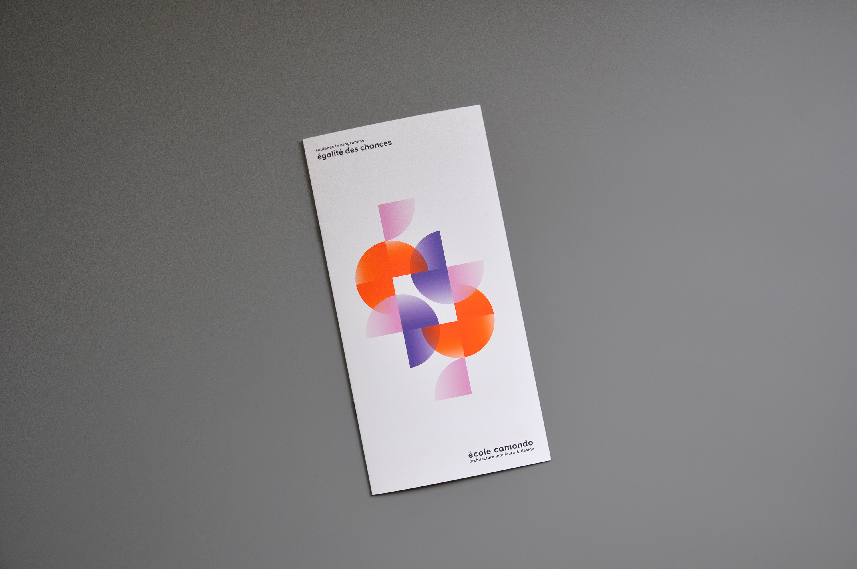 Un document d’appel au don et au mécénat. L’école d’architecture intérieure et de design propose en effet que certains étudiants puissent suivre leur scolarité grâce à son financement par un tiers (entreprise, particulier…). Ce programme, intitulé « égalité des chances », comporte les même initiales que celles de l’école Camondo. Afin d’évoquer l’égalité, j’ai donc exploité de manière graphique ces initiales, qui se répondent en miroir. Des couleurs vives et contrastées, renforcées par un Pantone orange, viennent dynamiser le visuel.