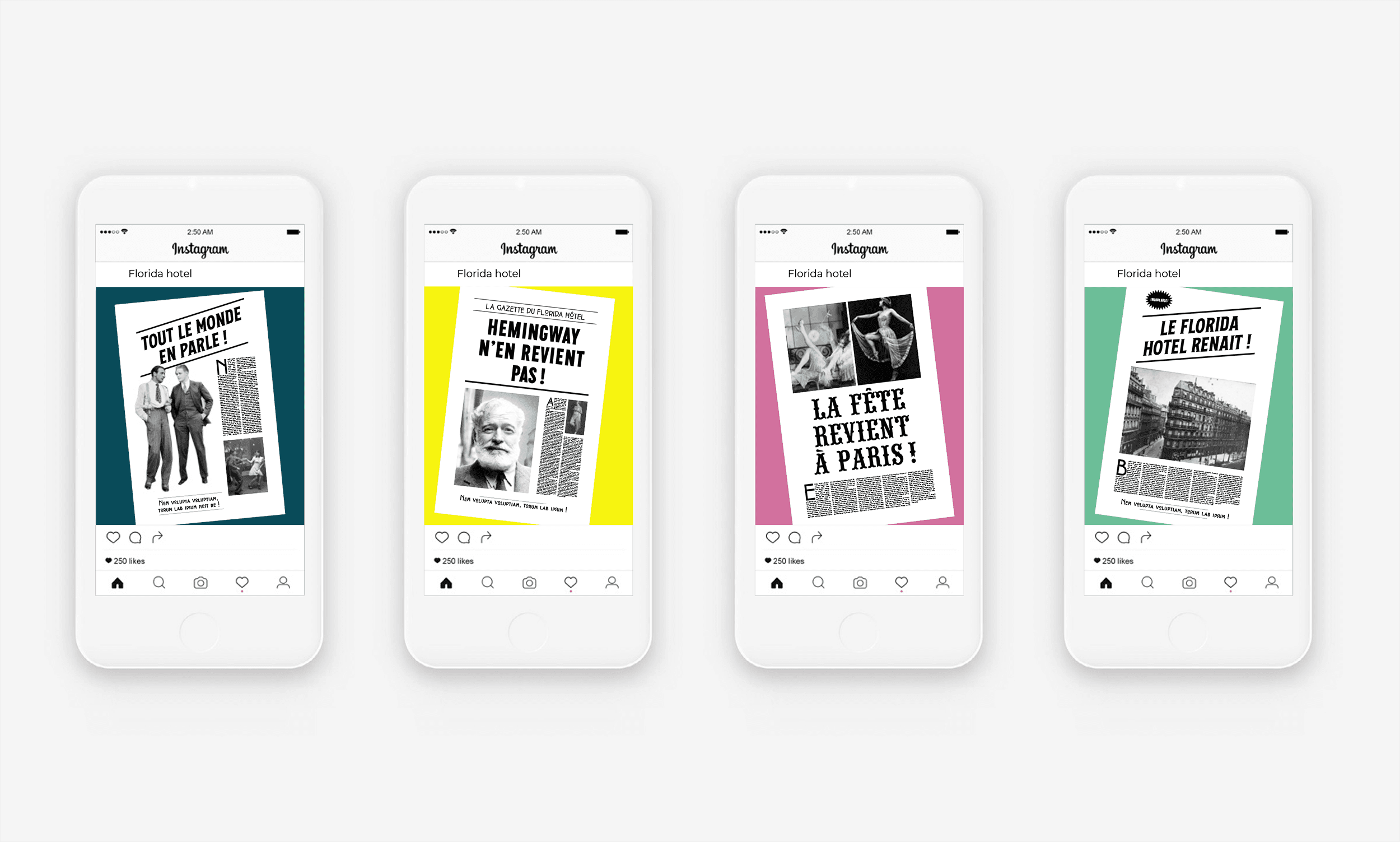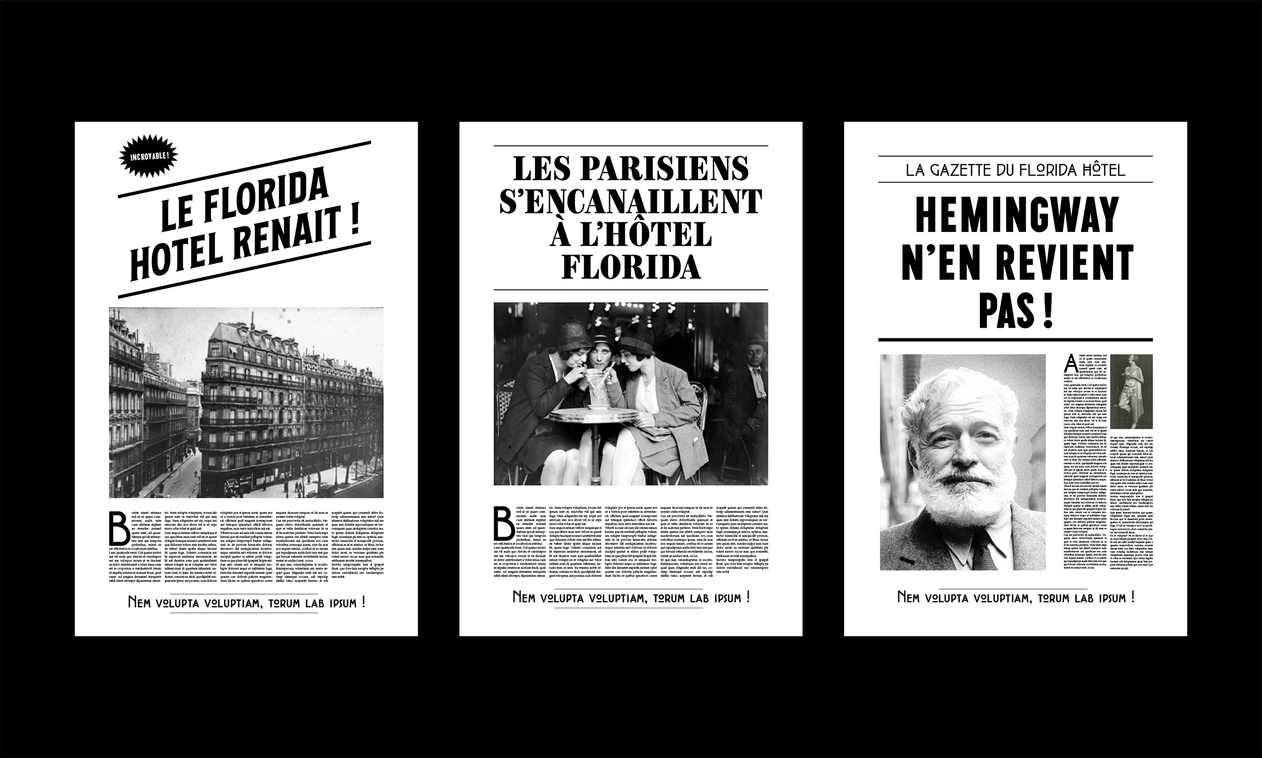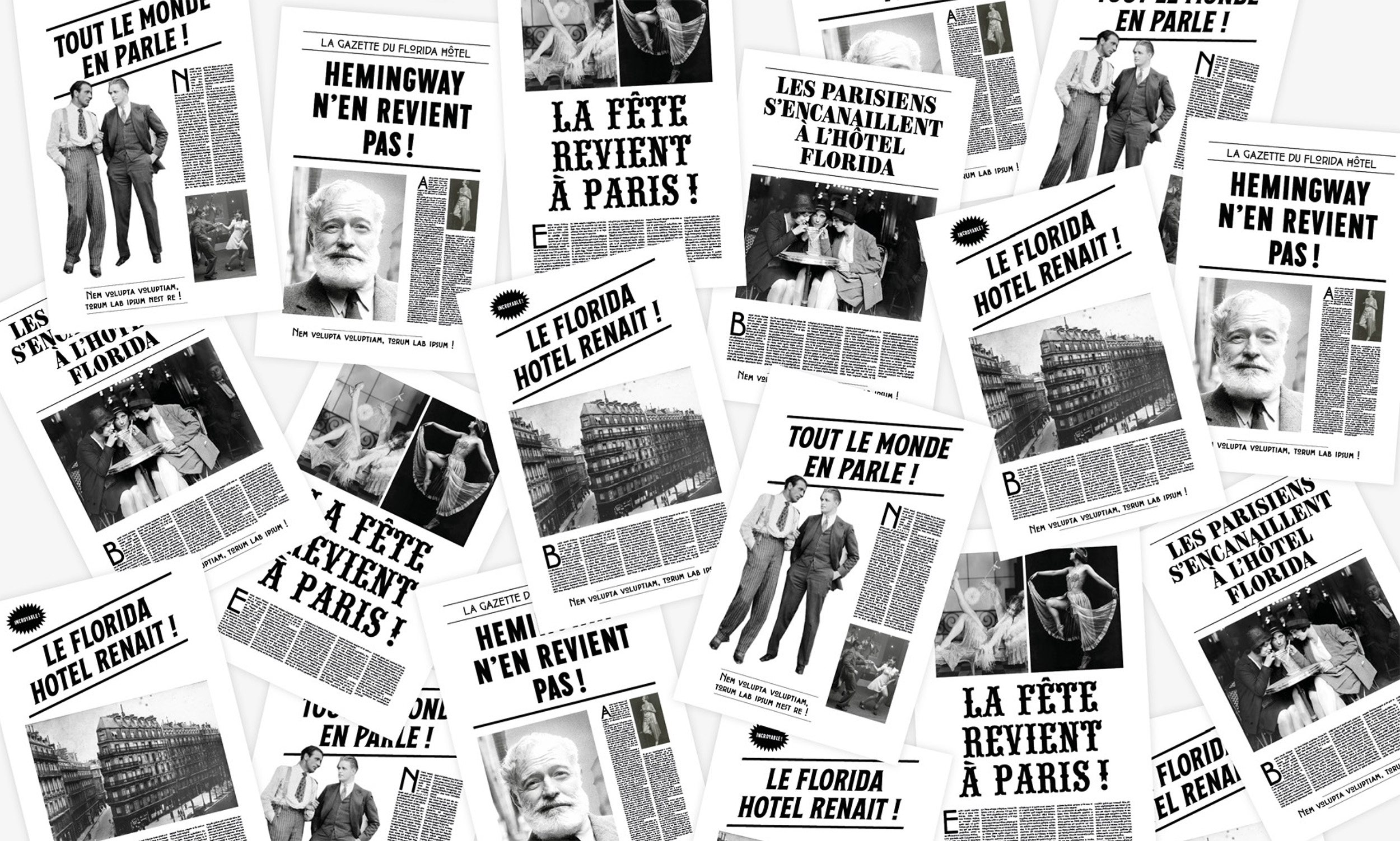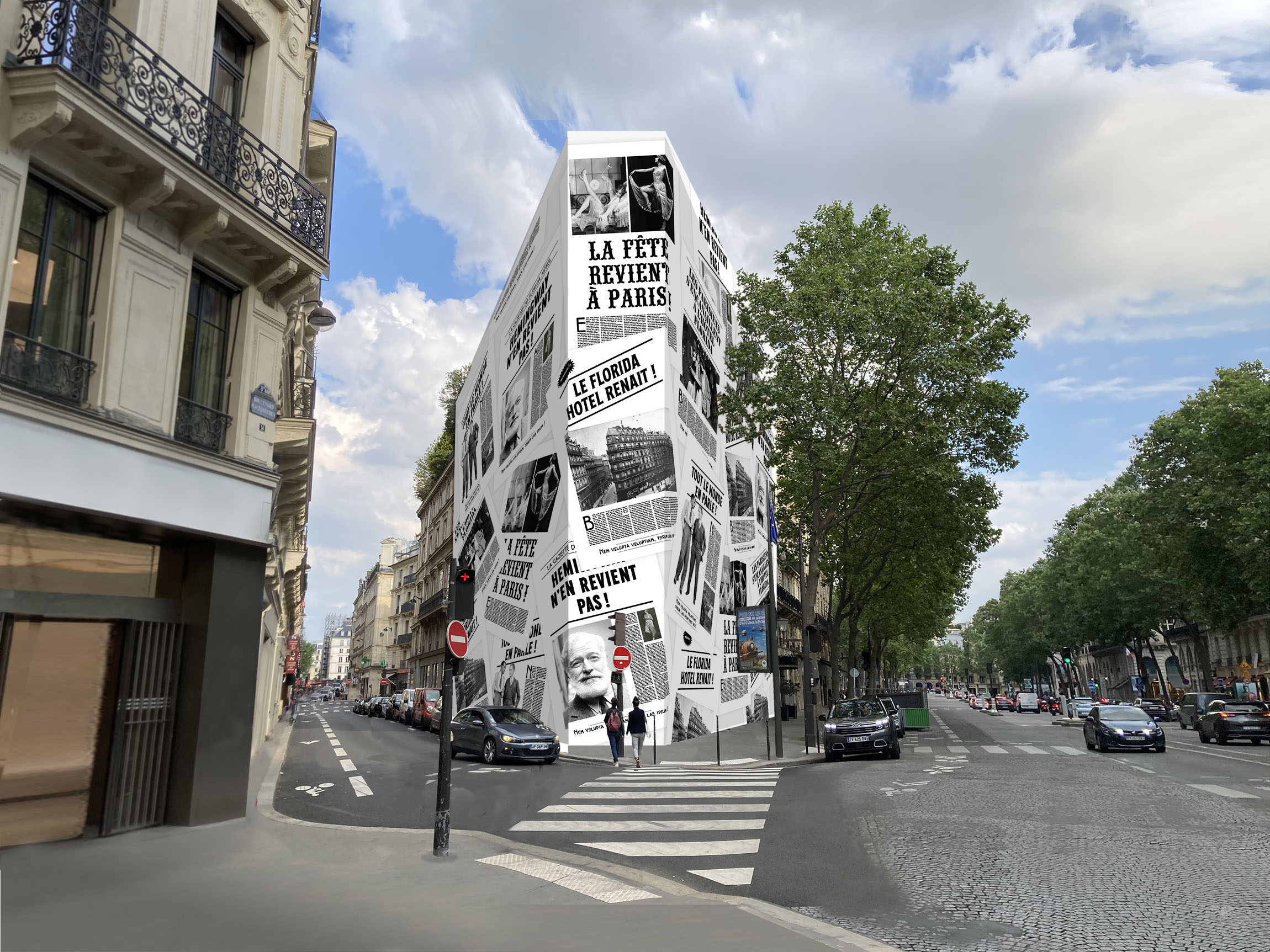 Propositions d’identité visuelle et de toile grand format pour ce projet de rénovation intégrale d’un immeuble parisien destiné à devenir un hôtel. Je me suis inspiré de l’histoire du lieu, qui était célèbre à la belle époque (début XXe) pour avoir été fréquenté par des écrivains comme Hemingway. J’ai donc proposé des visuels aux accents « rétro », amusants et décalés, afin de susciter la curiosité et l’intérêt des passants pendant toute la durée des travaux.