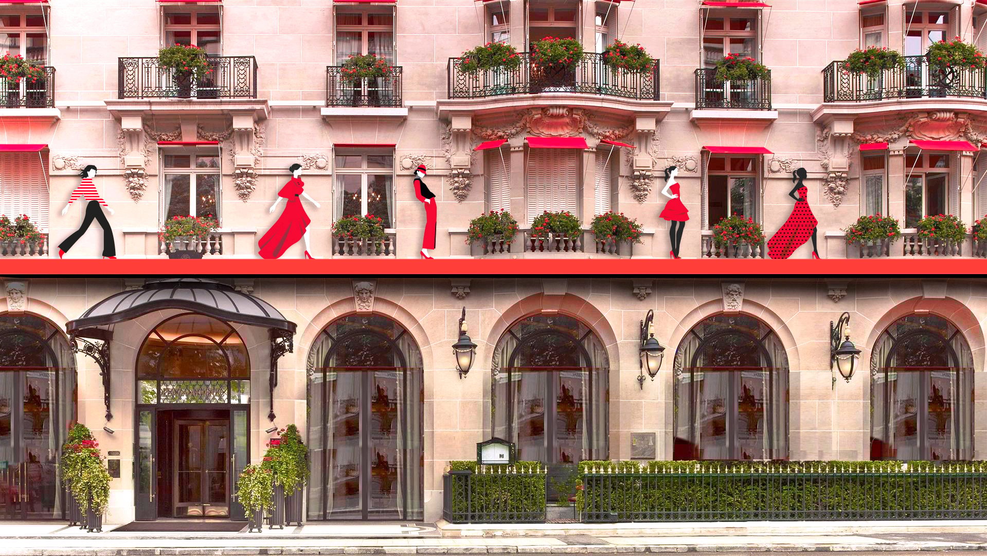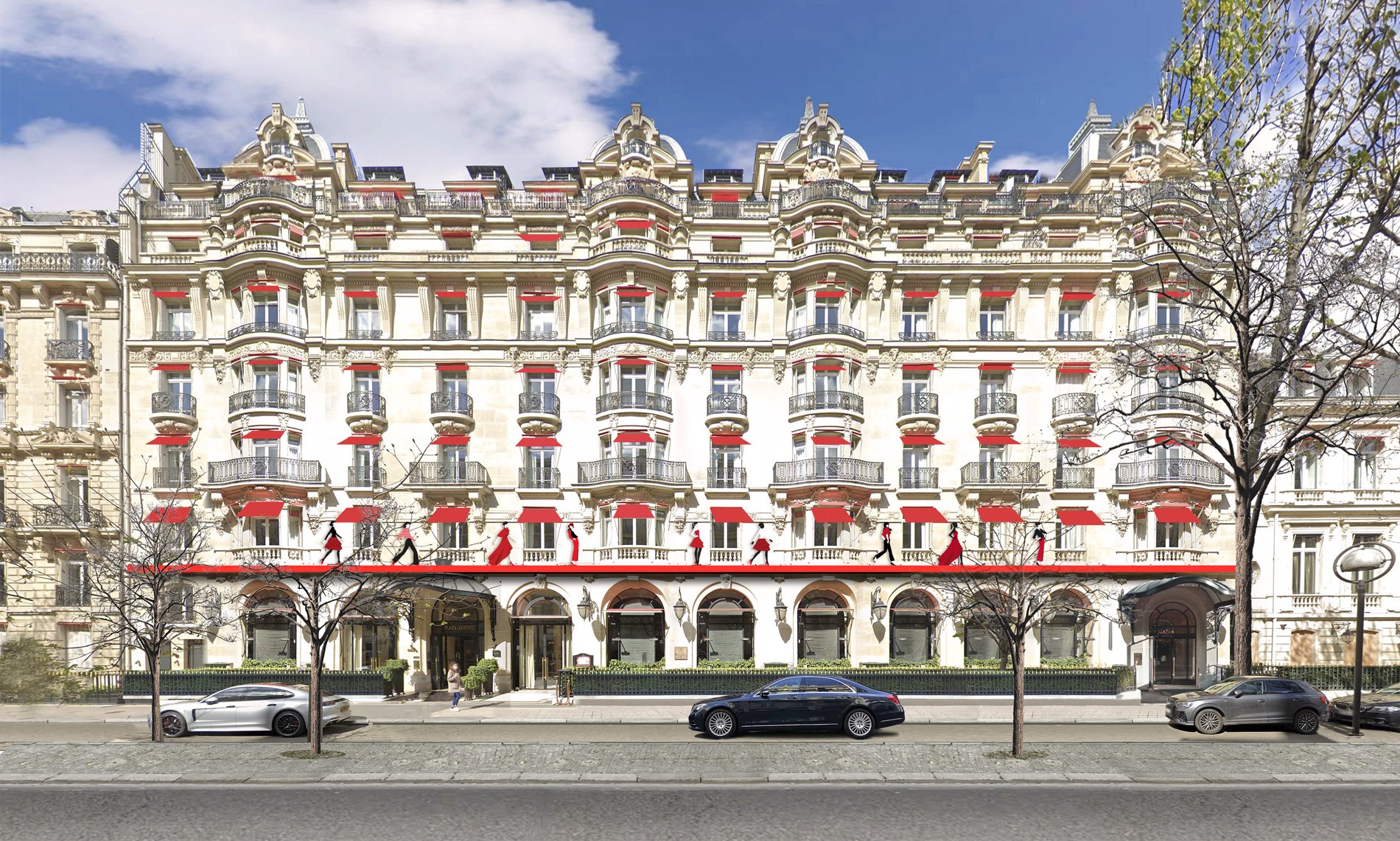 Situé avenue Montaigne, au cœur de la mode parisienne, ce prestigieux hôtel vit au rythme de la Haute Couture depuis toujours. Il est naturellement un lieu de célébration de la Fashion week. Pour cette session 2023, j’ai proposé que des silhouettes de mannequins défilent sur un catwalk installé sur la façade ! Une installation qui mèle audace, chic et élégance.