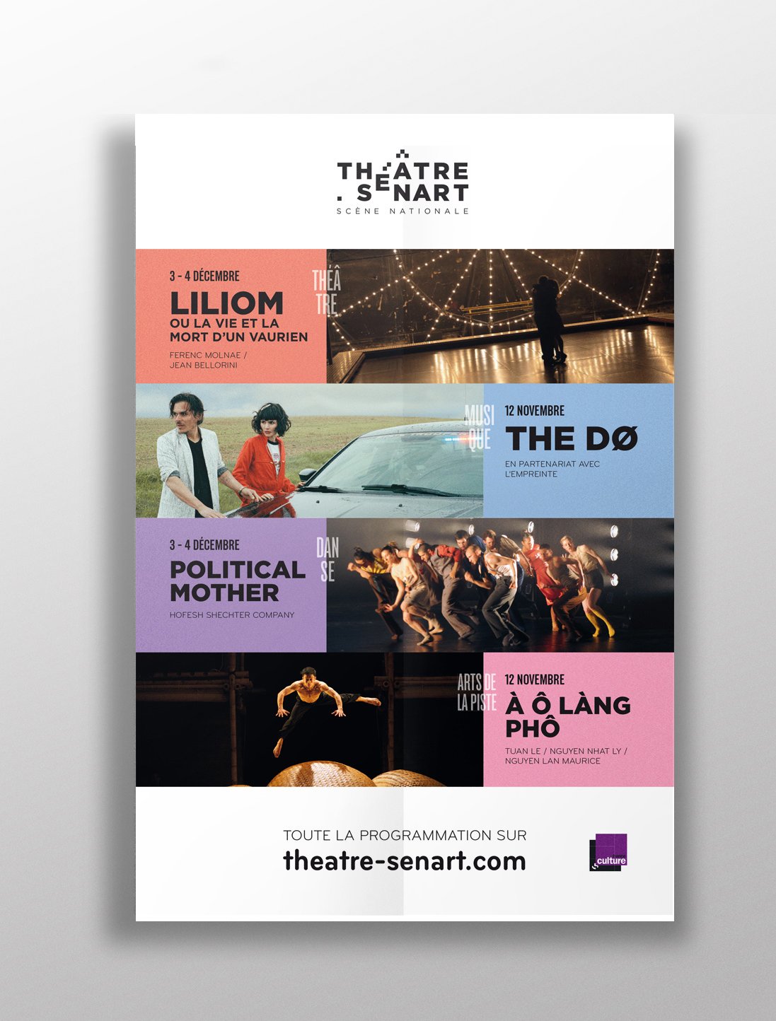 Identité visuelle globale de la scène nationale du Théâtre Sénart. Conception du logotype mais aussi – et surtout – de l’ensemble de la communication : visuels d’ouverture de saison, site web, programme… et ce depuis 2014. Le souhait du théâtre était de le rendre accessible à tout le monde. Il s’agissait donc de lui donner une image sympathique et chaleureuse, dans laquelle chacun puisse se retrouver et se projeter, initié ou pas au théâtre. Sa devise : « Un théâtre exclusivement réservé à tout le monde ». Chaque saison (voir la saison 2017-18 et 2018-19) a donné lieu à un shooting spécifique.